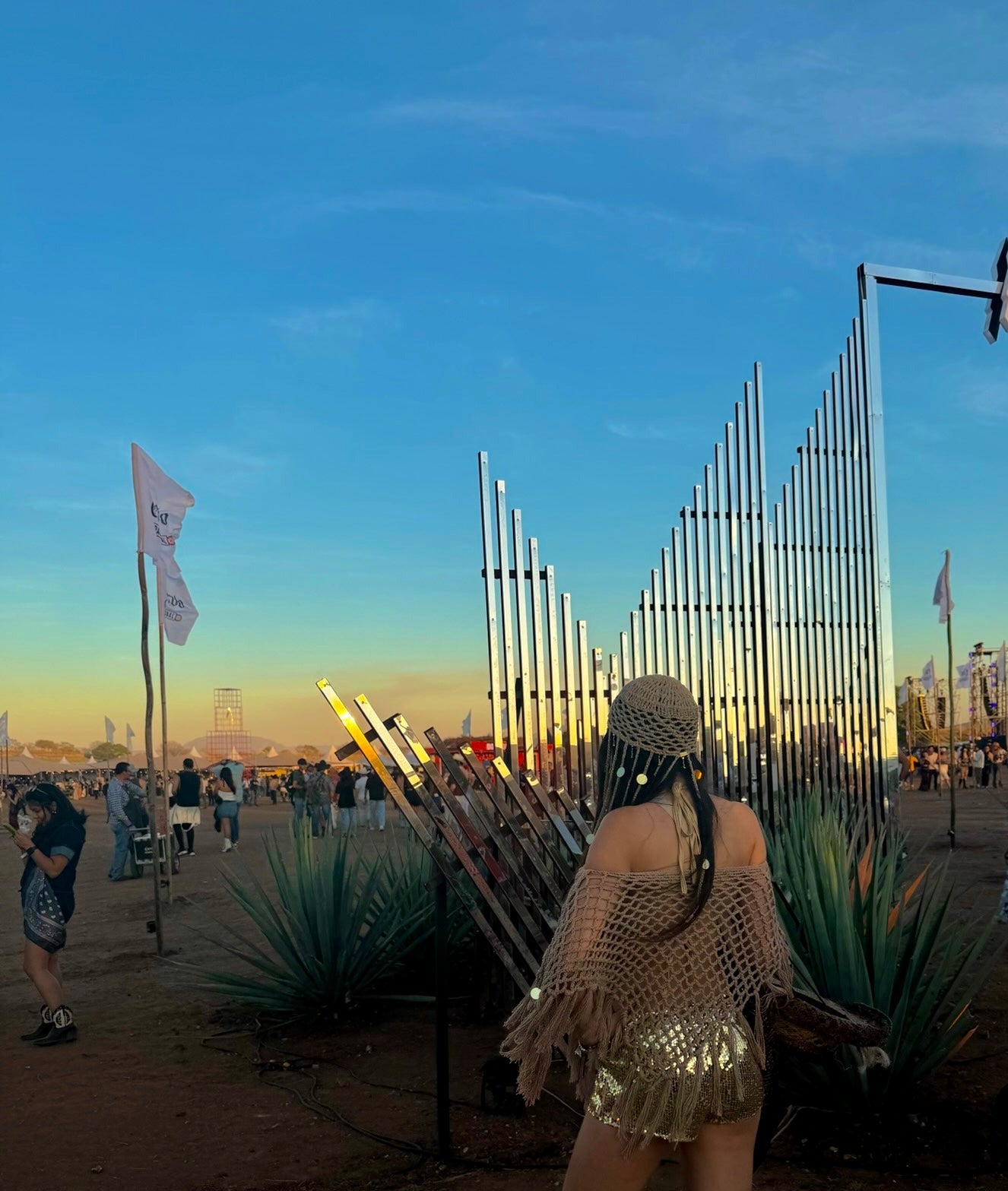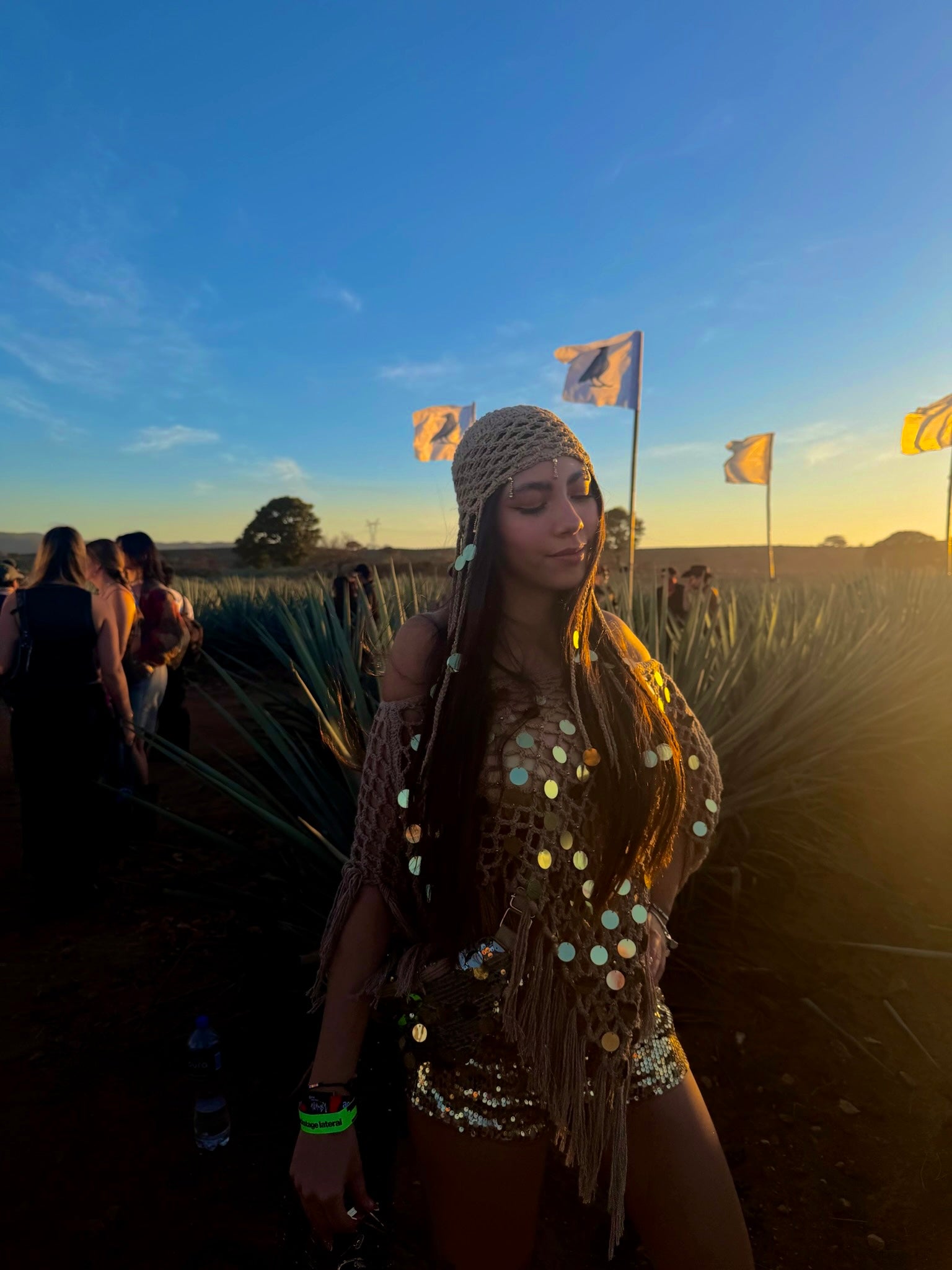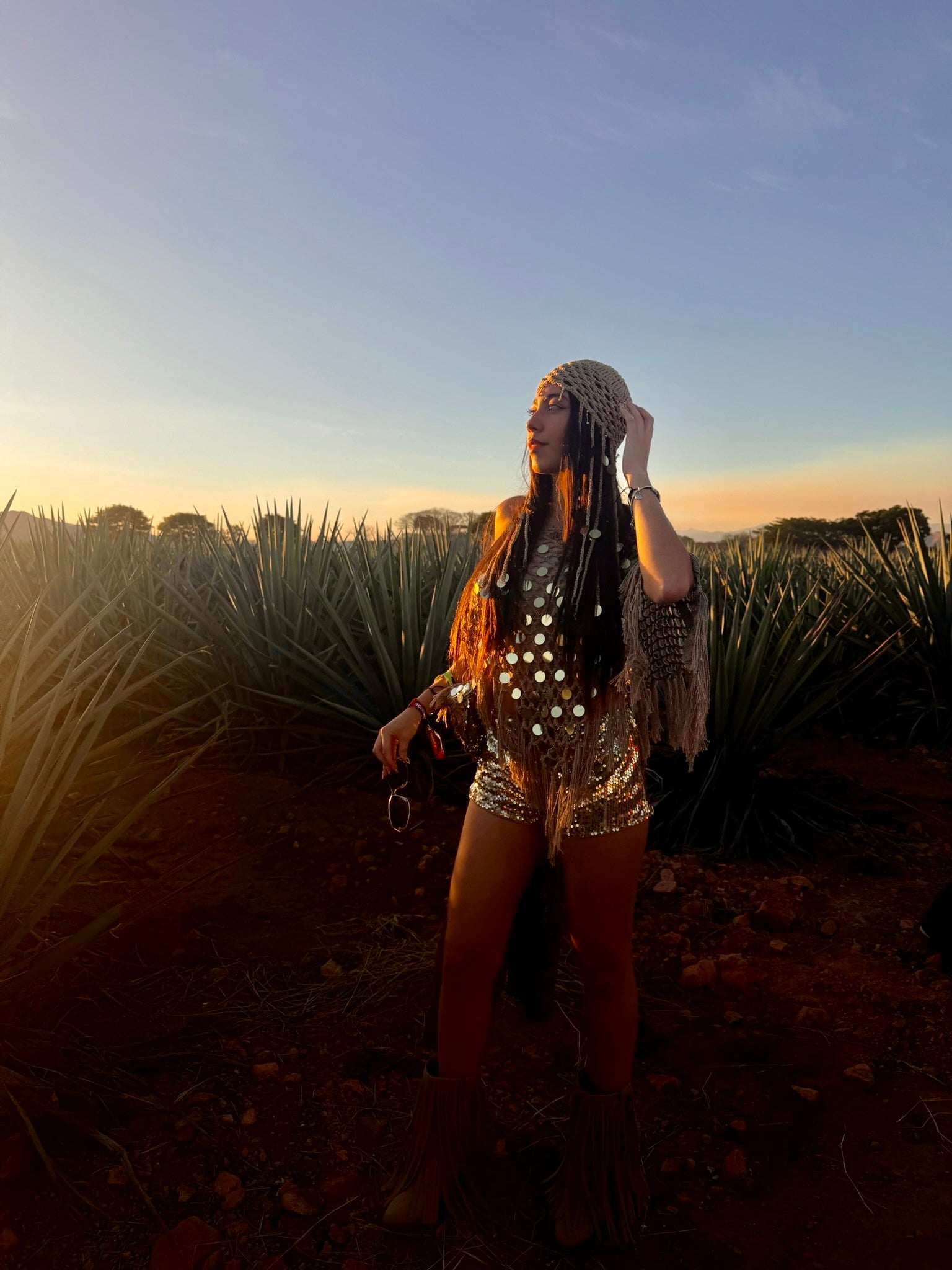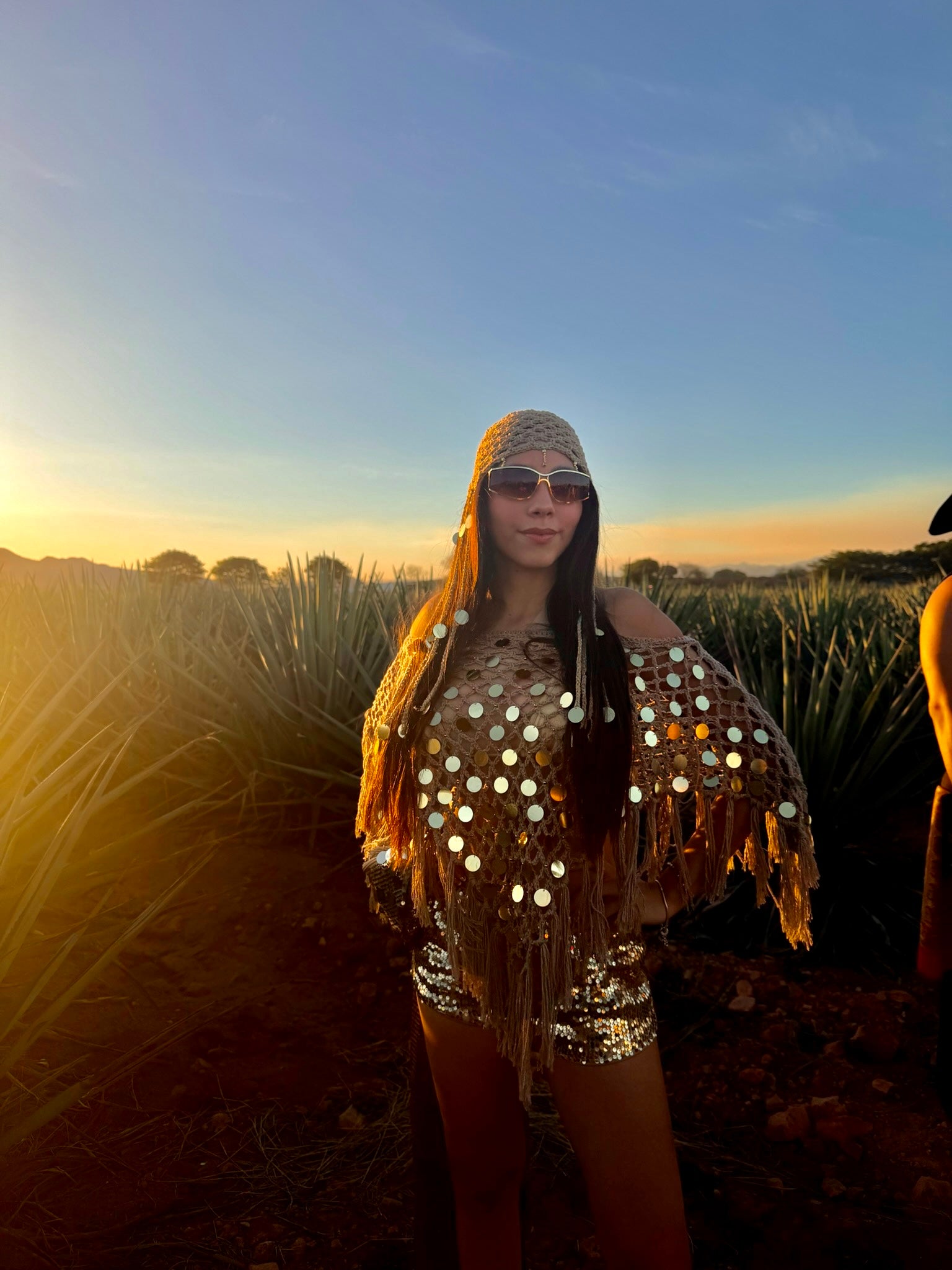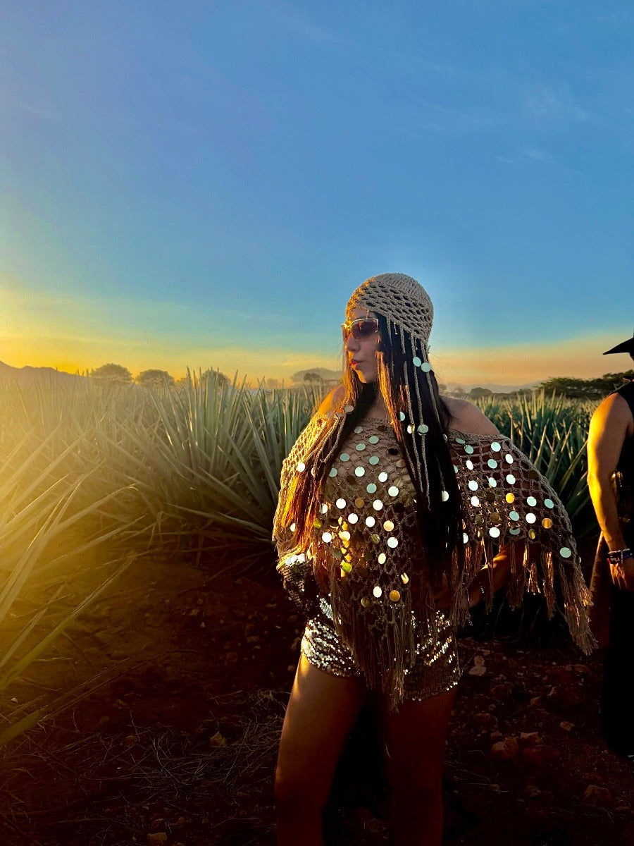 Chal tejido a mano con flequillos y lentejuelas doradas.