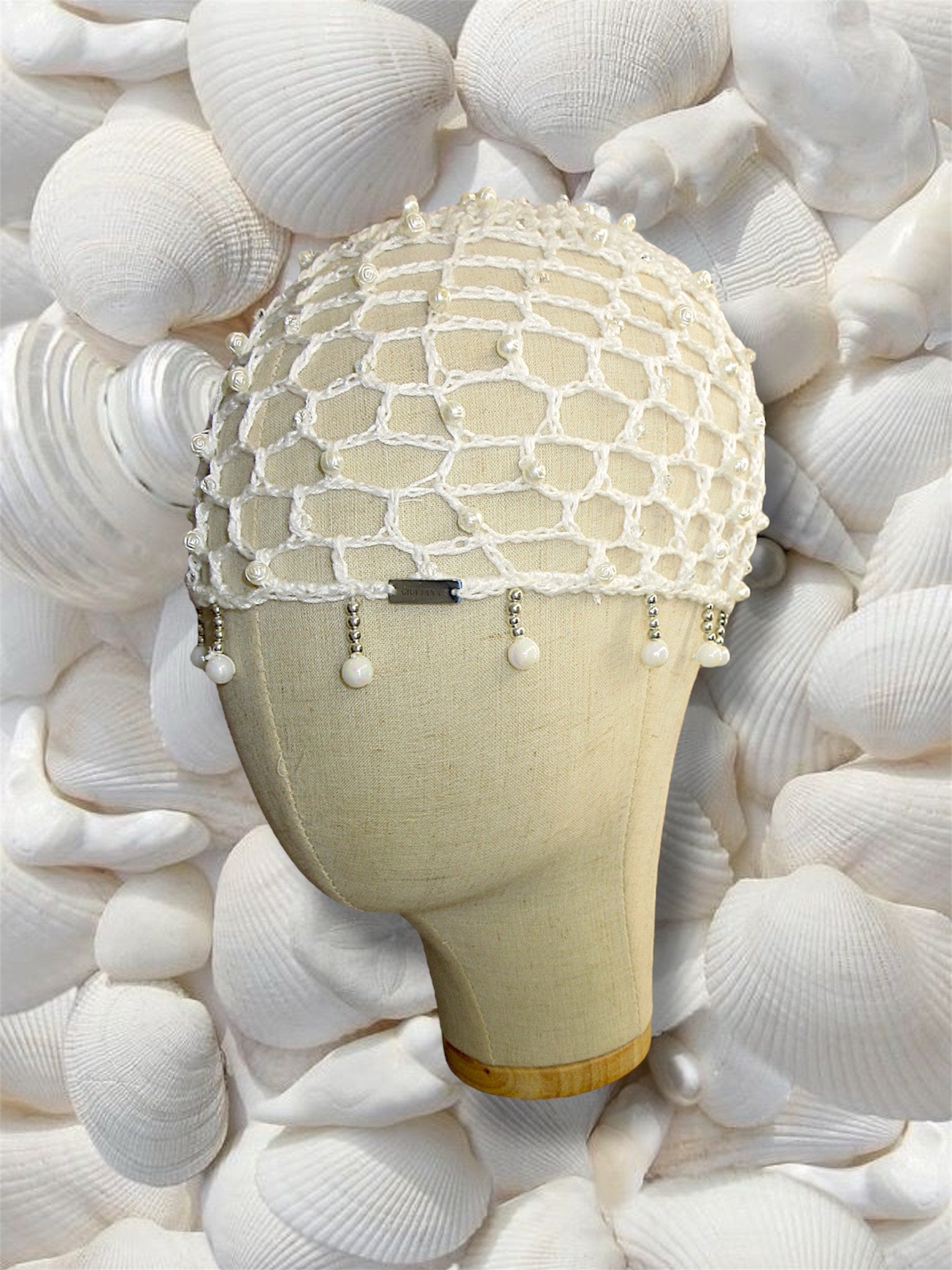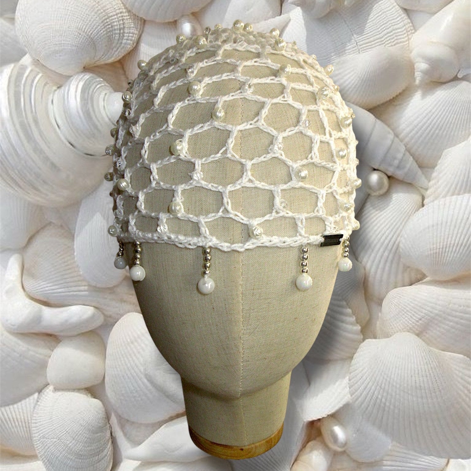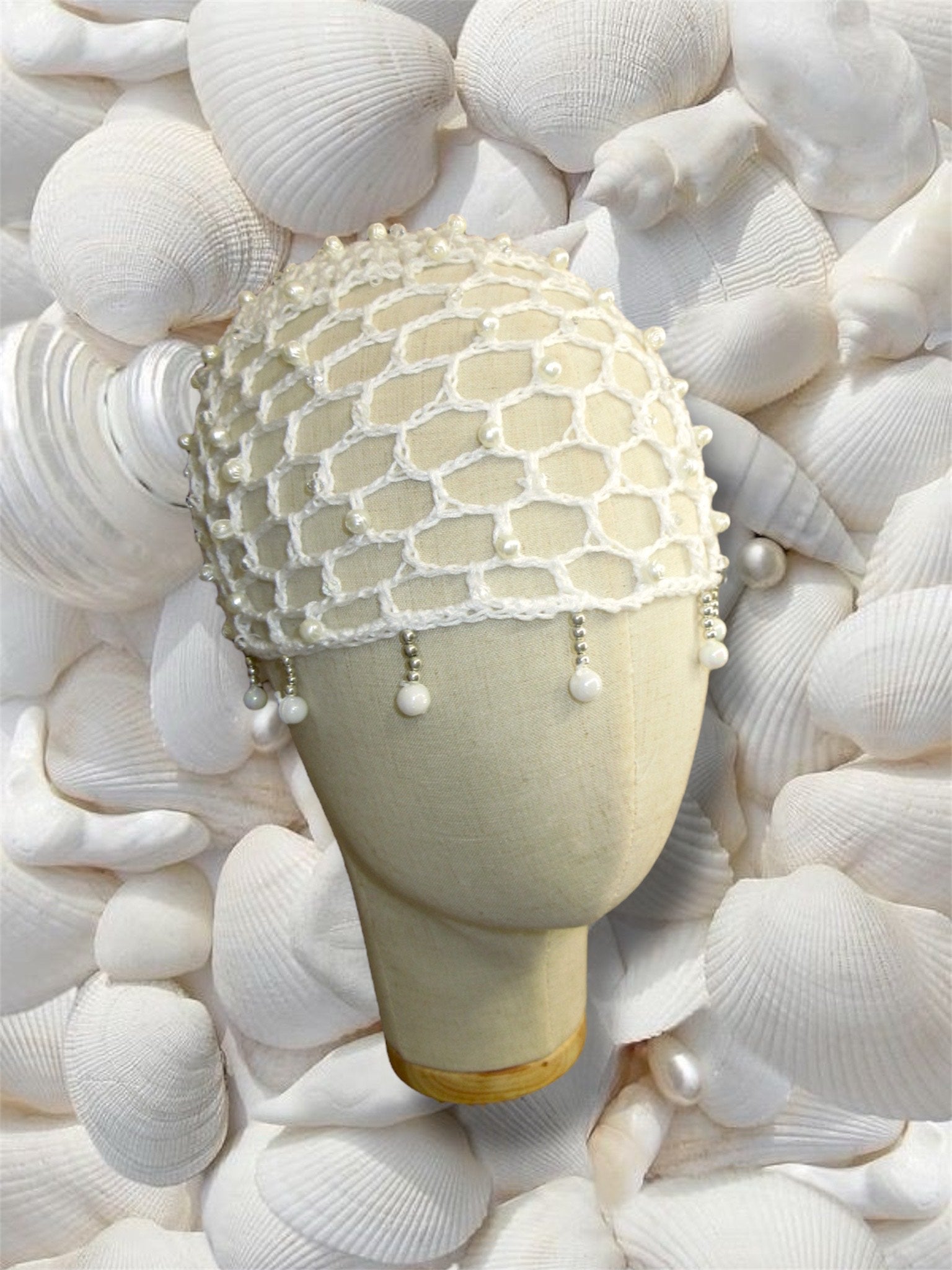 Red tejida a mano cuentas blancas,plateadas y transparentes.